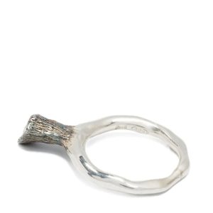 De collectie bestaat uit grote zilveren ringen, vaak bezet met bijzondere edelstenen zoals smokey quartz of beer quartz, omringd door diamanten in tinten van zwart, zilvergrijs of cognac. Elk sieraad is een samensmelting van contrasten: smal en robuust, elegant en ruw, imperfect maar vol karakter.