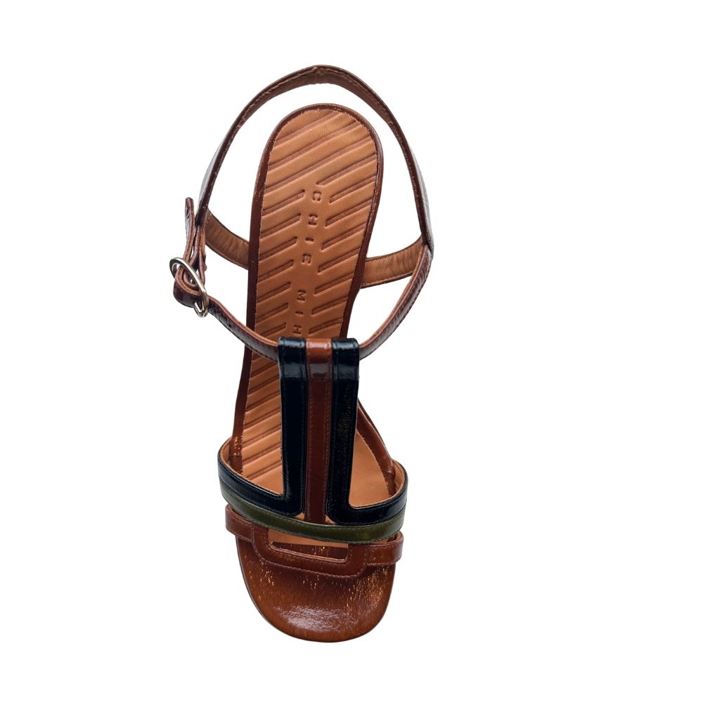 Bruine lakleren plateau sandaal Peyate met blauwe en groene details. Hakhoogte 7cm
