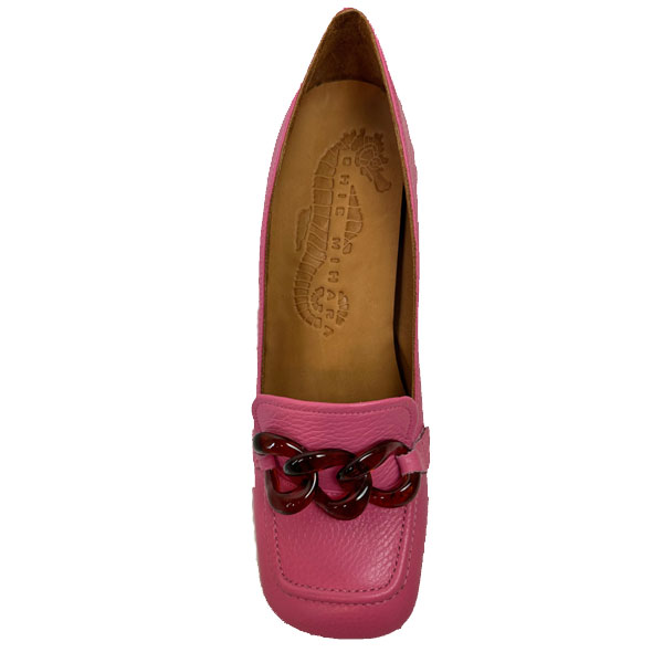 Roze leren loafer pump met bruine gesp, hak 7cm