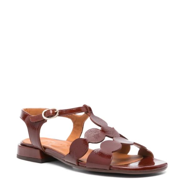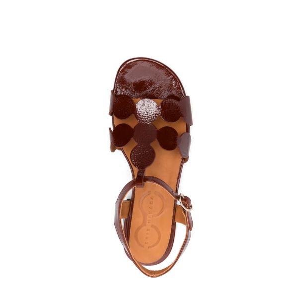 Bruine lakleren sandaal Toika met T-band en beklede hak.