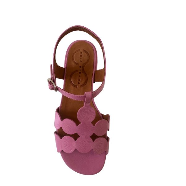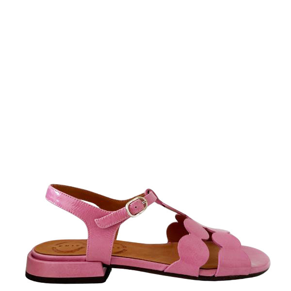 Roze lakleren sandaal Toika met T-band en beklede hak.