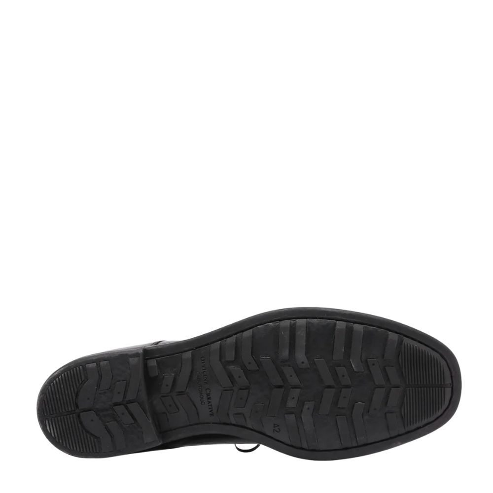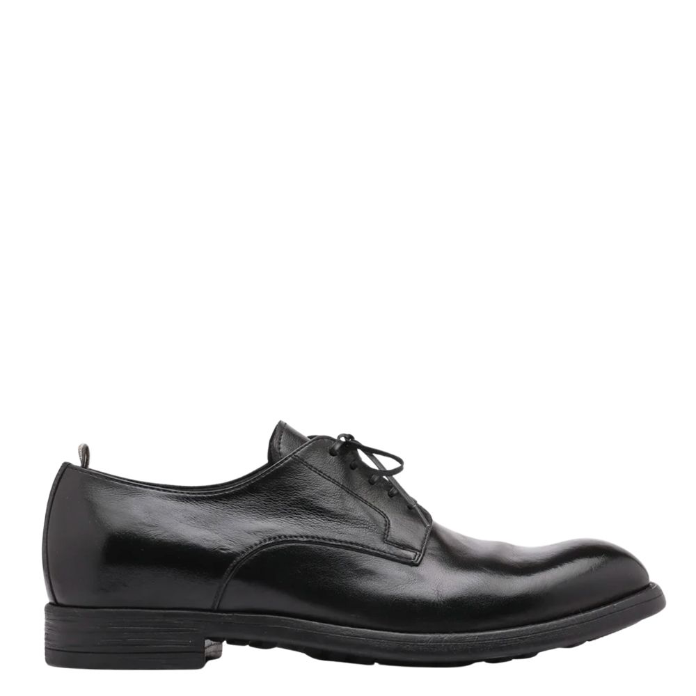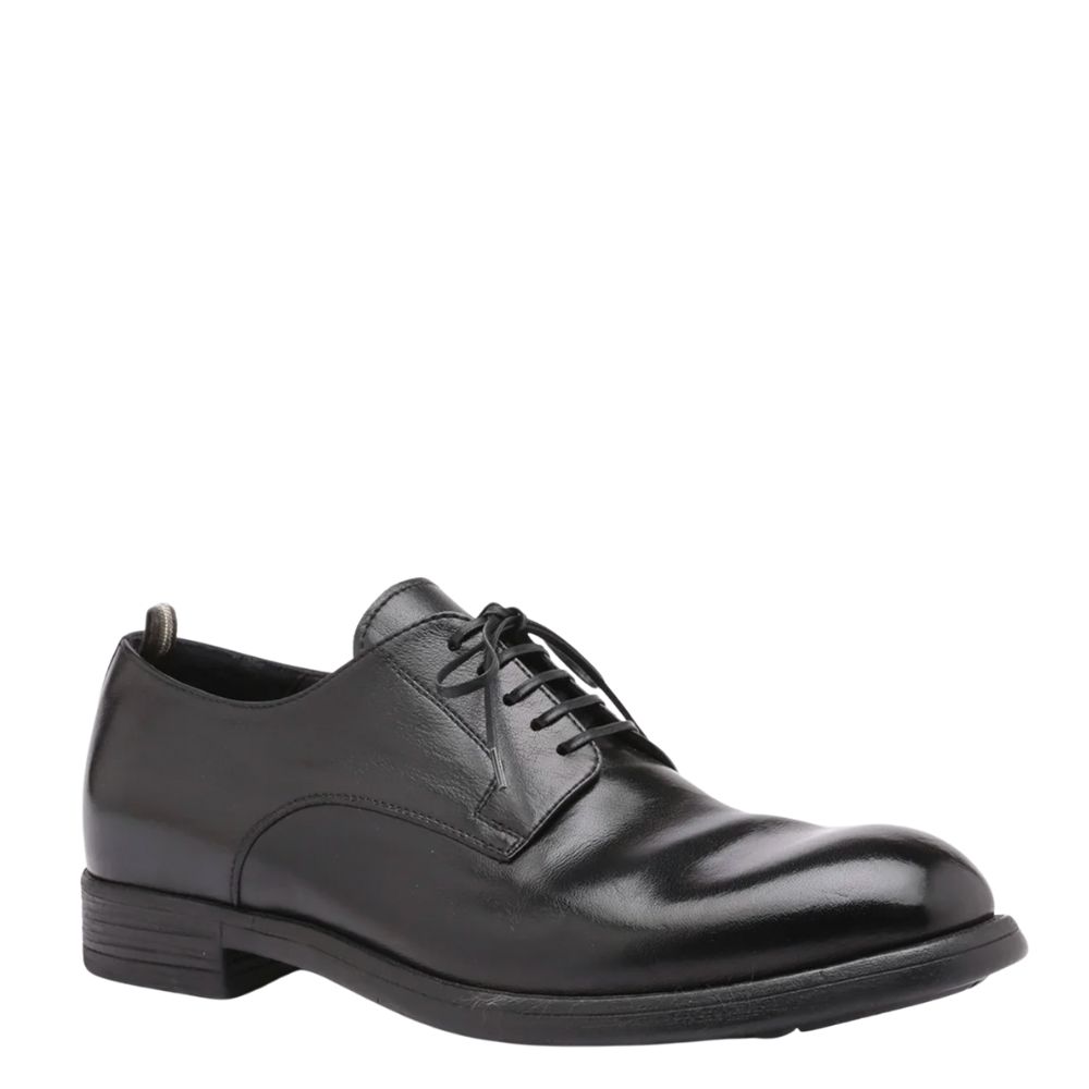 Schwarzer Leder-Derby mit Schnürverschluss mit dünnen, gewachsten Schnürsenkeln, einer Fersenschlaufe und einer Gummisohle.