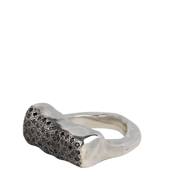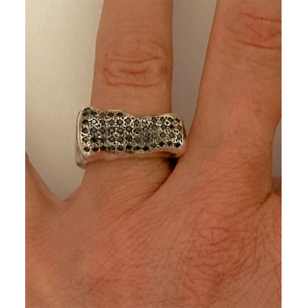 Silberner Roky-Ring mit 54 schwarzen Diamanten von 1,13 kt auf der Oberseite. Dieser Ring hat eine unregelmäßige, robuste Form und kann sowohl einzeln als auch gut in Kombination mit dem Riny von Rosa Maria getragen werden, der, wie auf dem Foto zu sehen, etwas dünner ist.