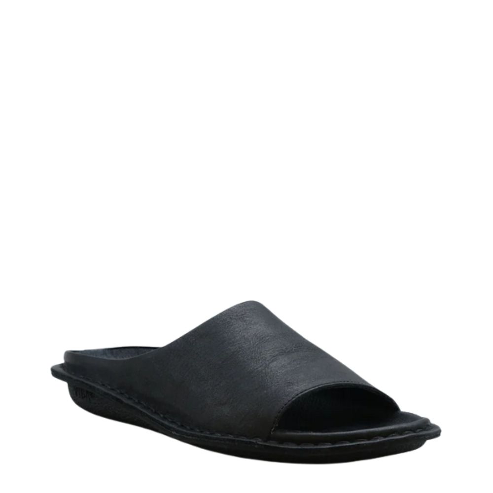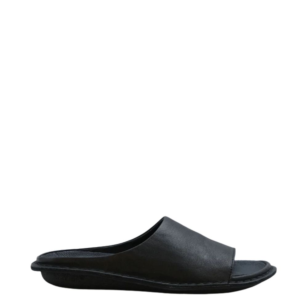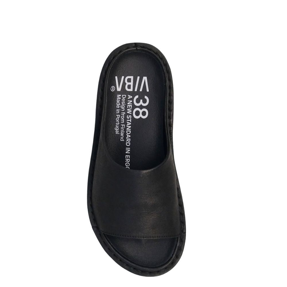 Minimalistische VIBAe Saint Tropez Unisex-Sandale in der Farbe Schwarz, aus geschmeidigem Leder.