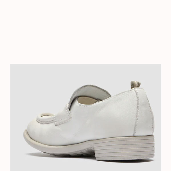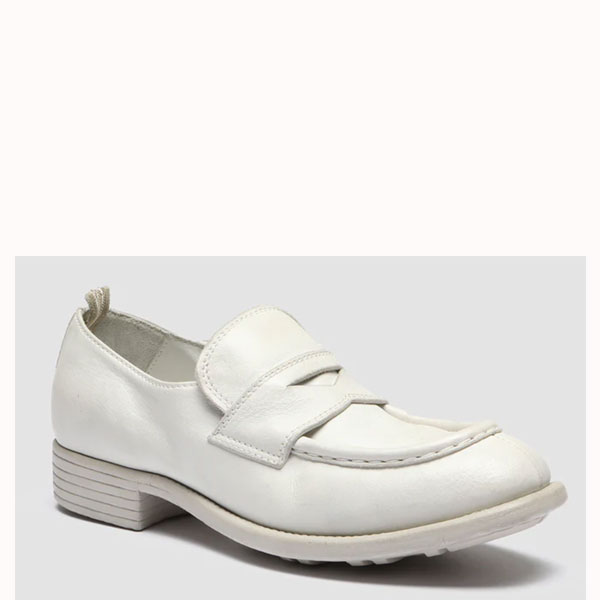 White leather loafer with rubber sole.