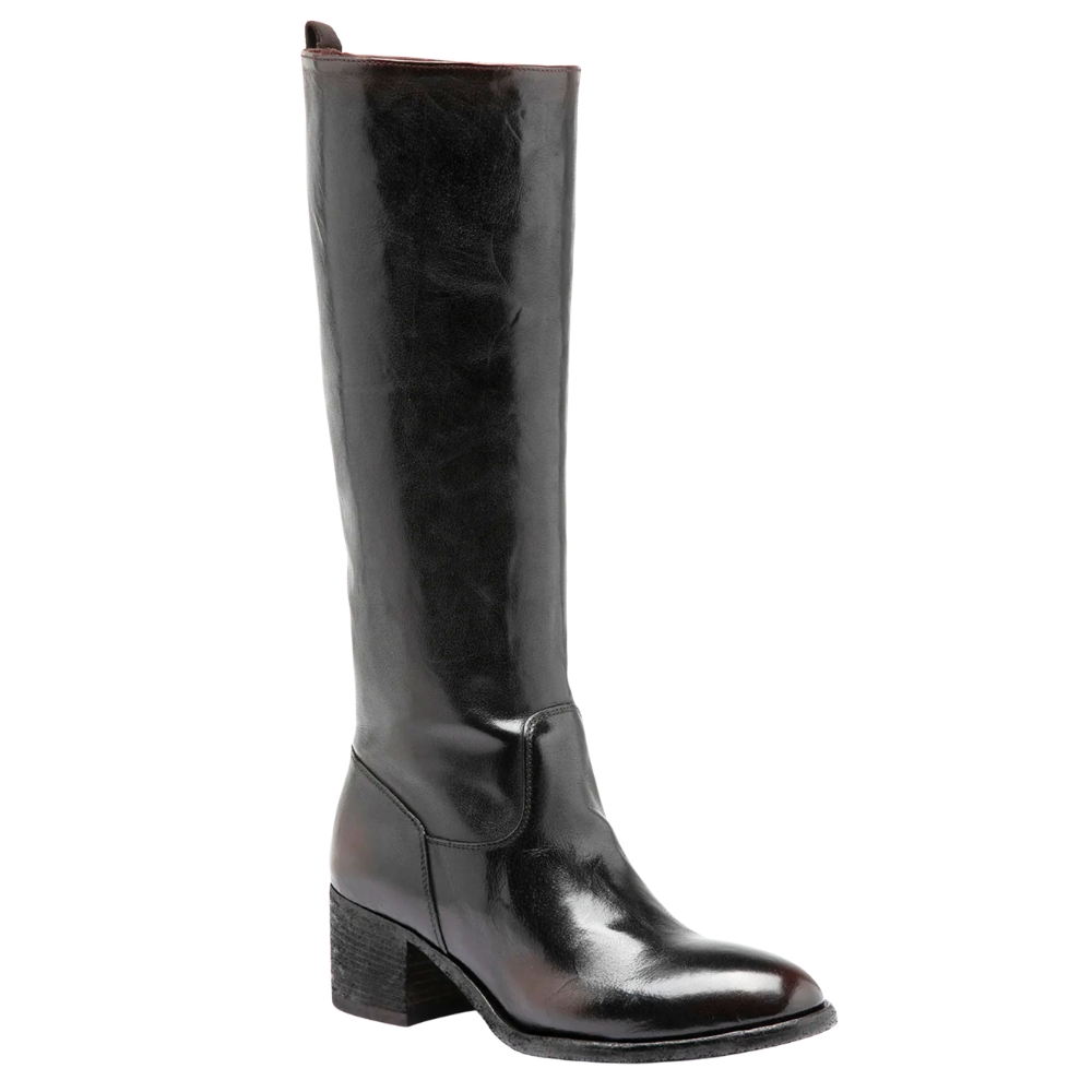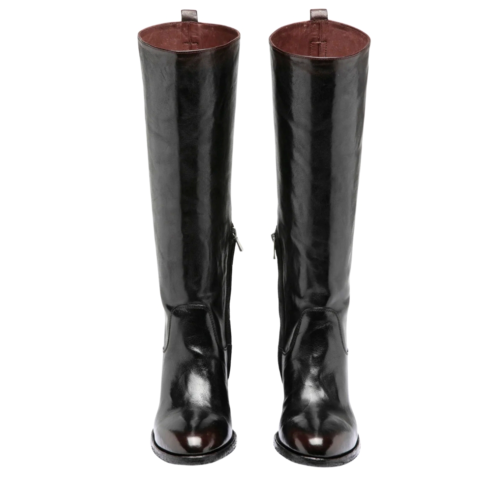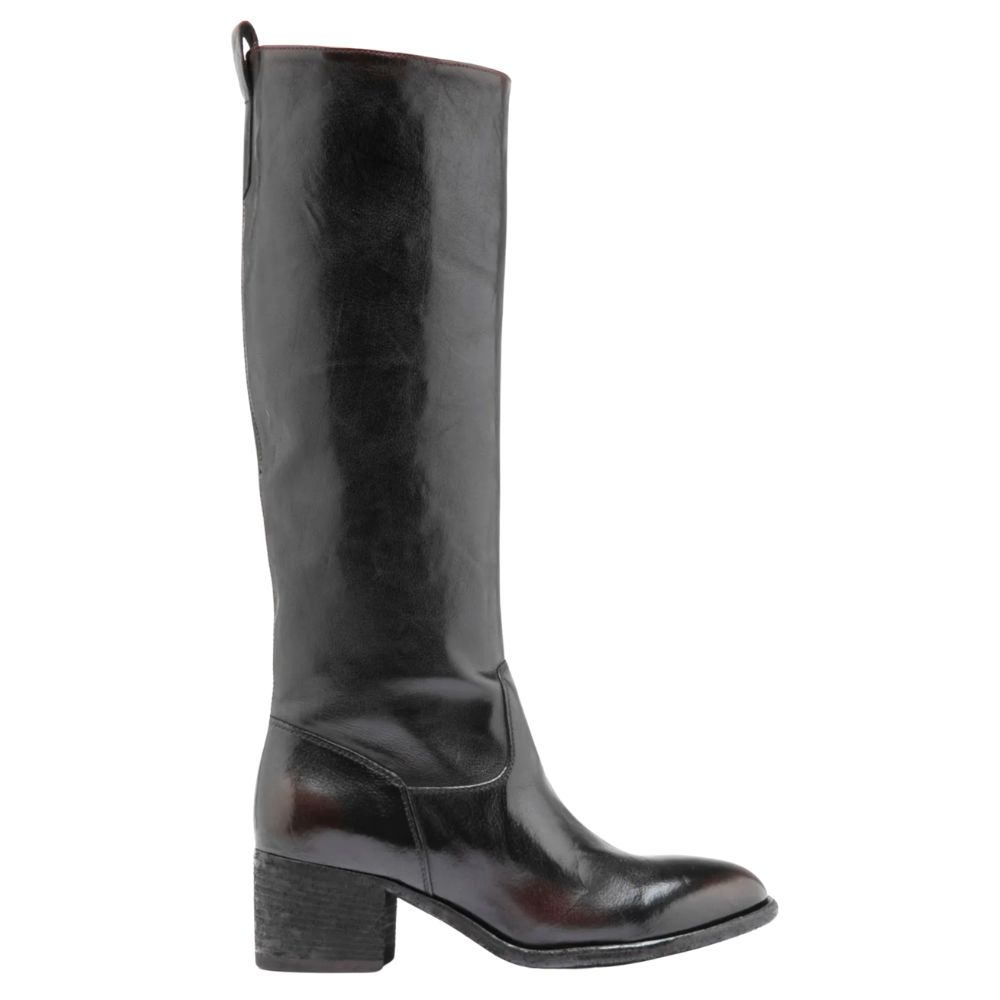 Skip to contentDark brown leather long Denner boot with 5.5 cm block heel and a leather sole with rubber pieces underneath.