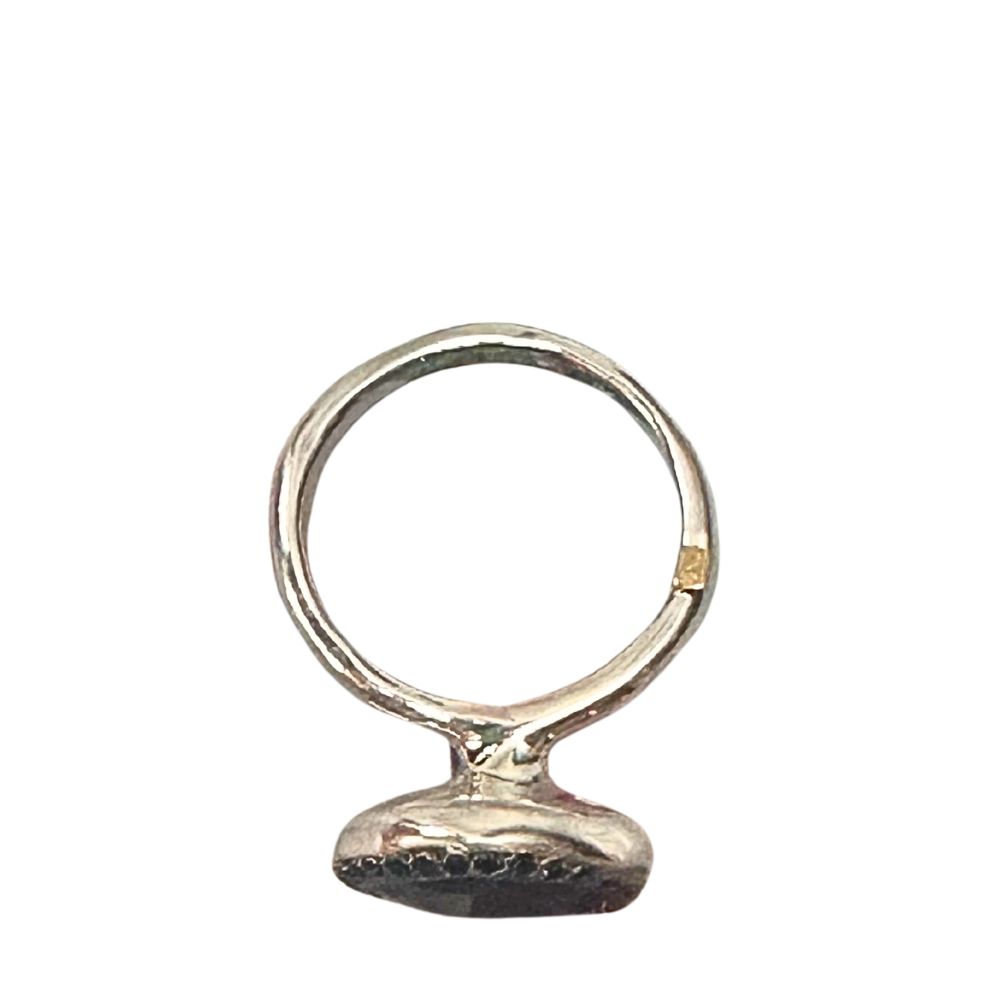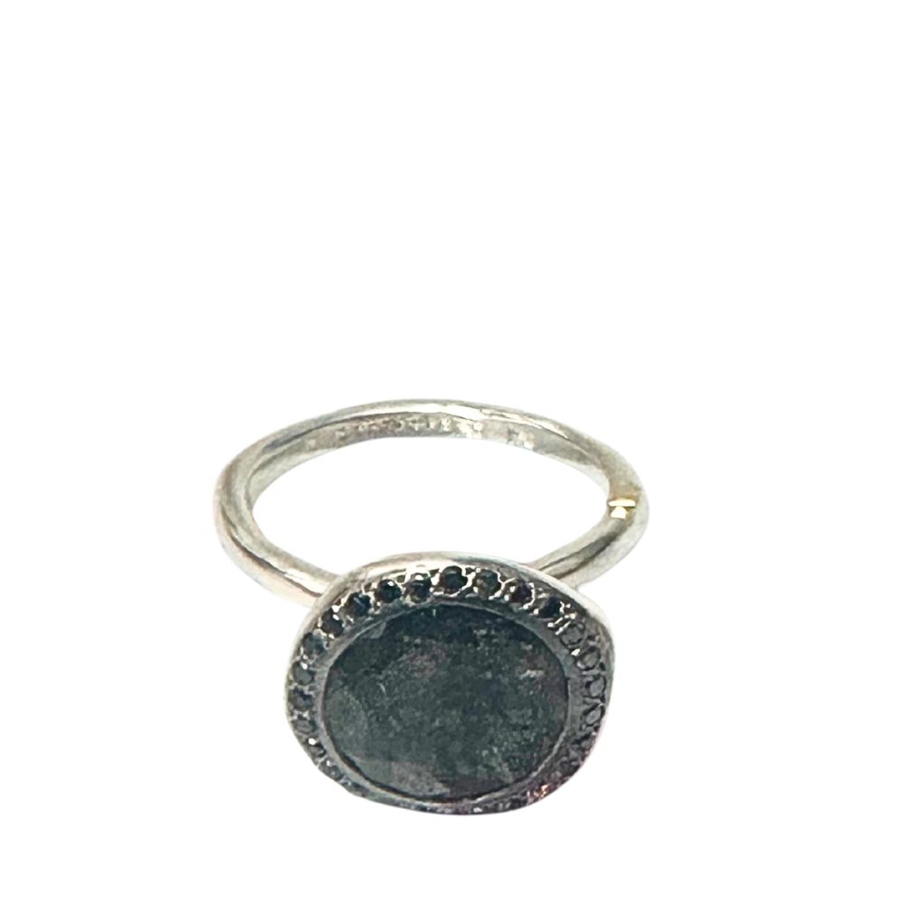 Silver Begum ring with a 2.9ct green rutilated quartz, surrounded by 29 black diamonds of 0.32ct
