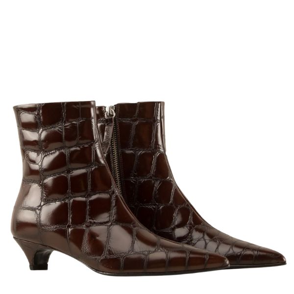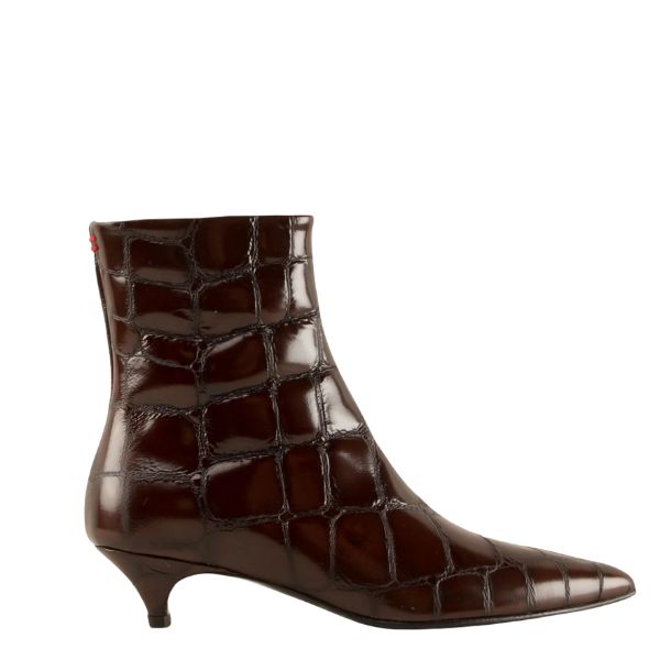 Bruine puntige croco print leren enkellaarzen, kleine hak 4cm