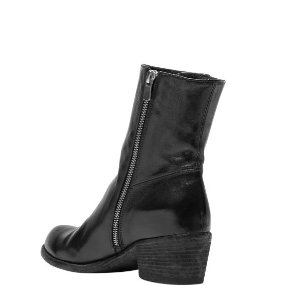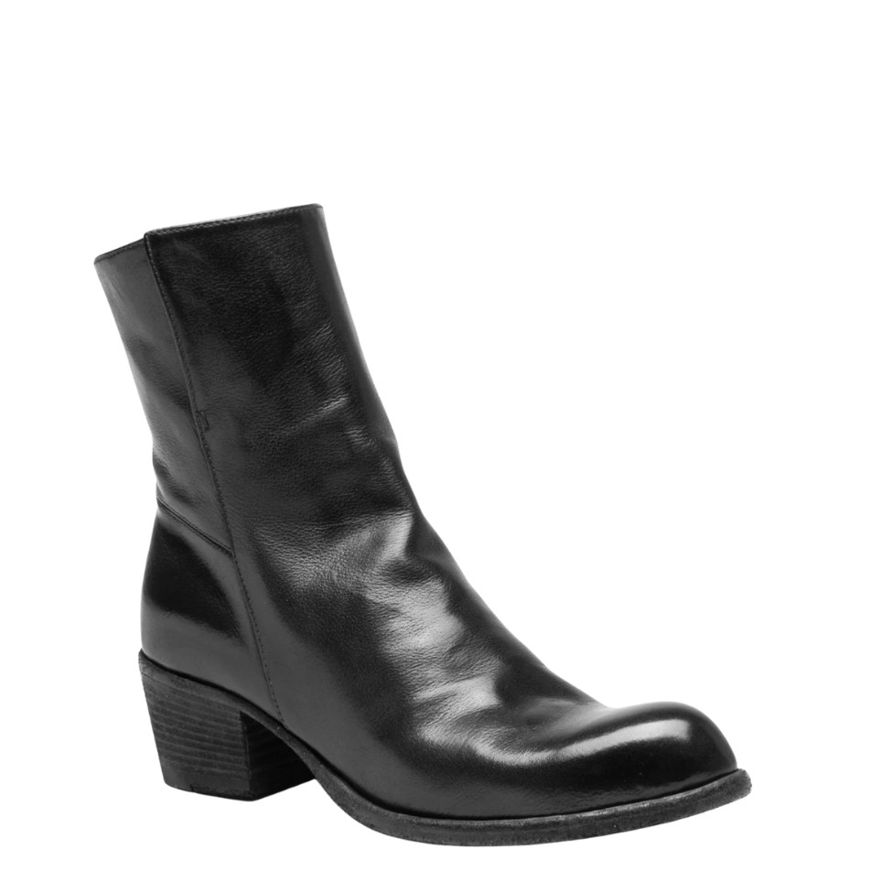 Zwart leren Wade enkellaarzen met ritssluiting binnenkant, licht schuine hak, en een naadloze leren zool met rubberen inzetstuk voor extra grip. Handgemaakt in Italië.