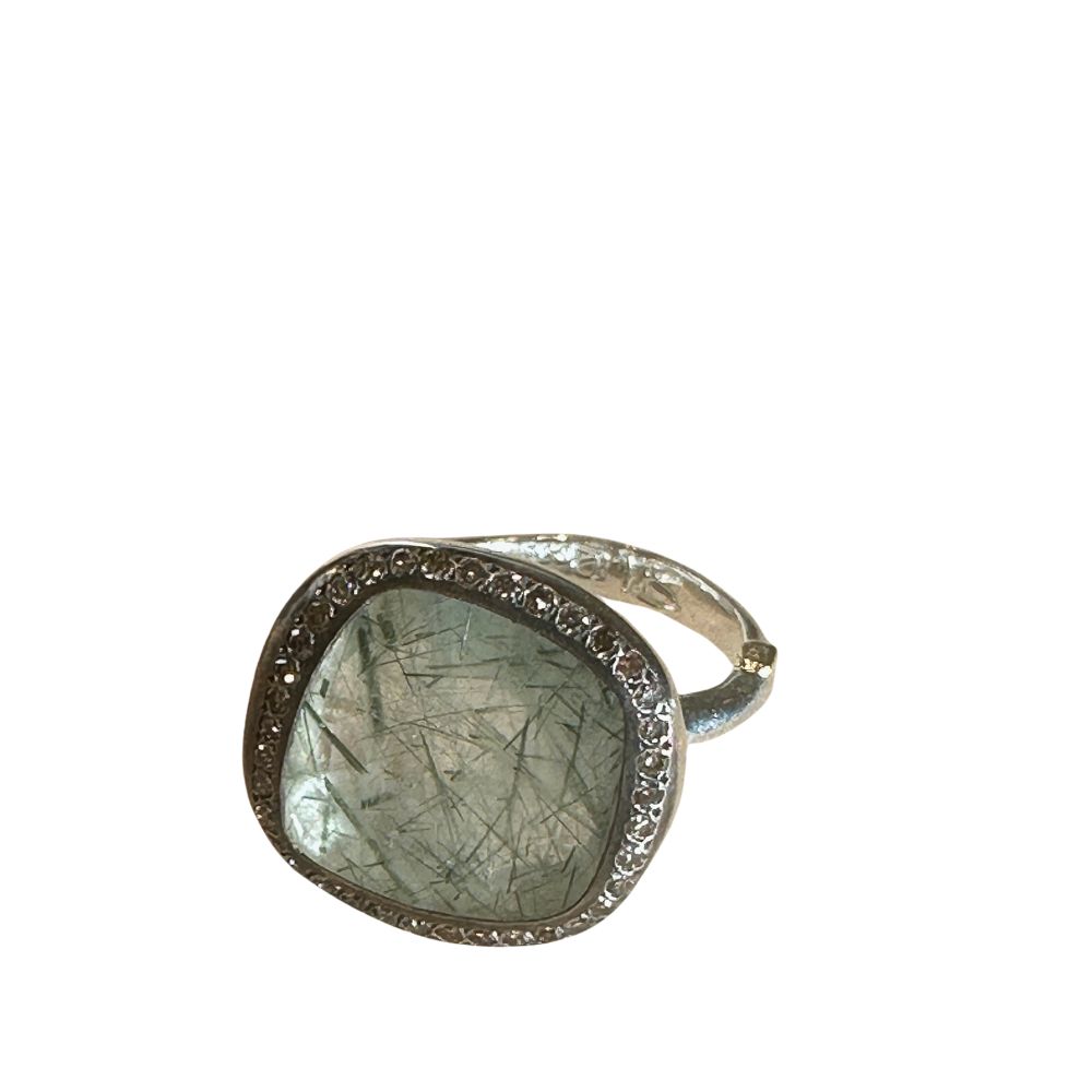 Zilveren Junya ring met een groene gestreepte kwarts van 6,65kt omringd door 39 schitterende cognac kleurige diamanten van 0,44kt