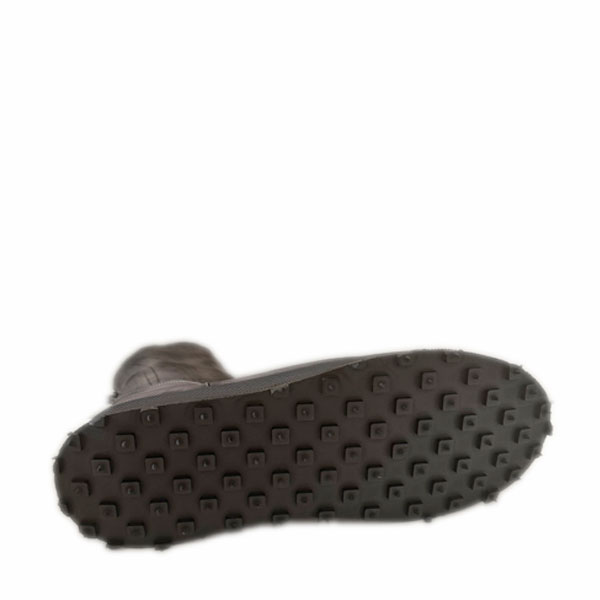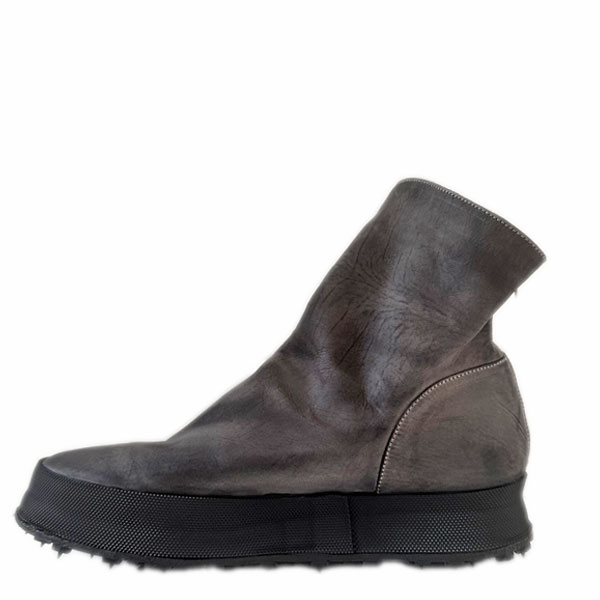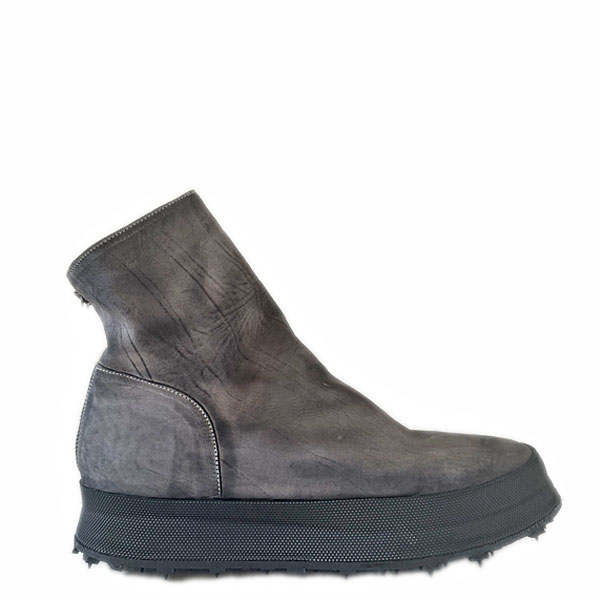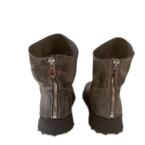Grijs leren laars, ritssluiting op de hiel en zwarte rubberen zool